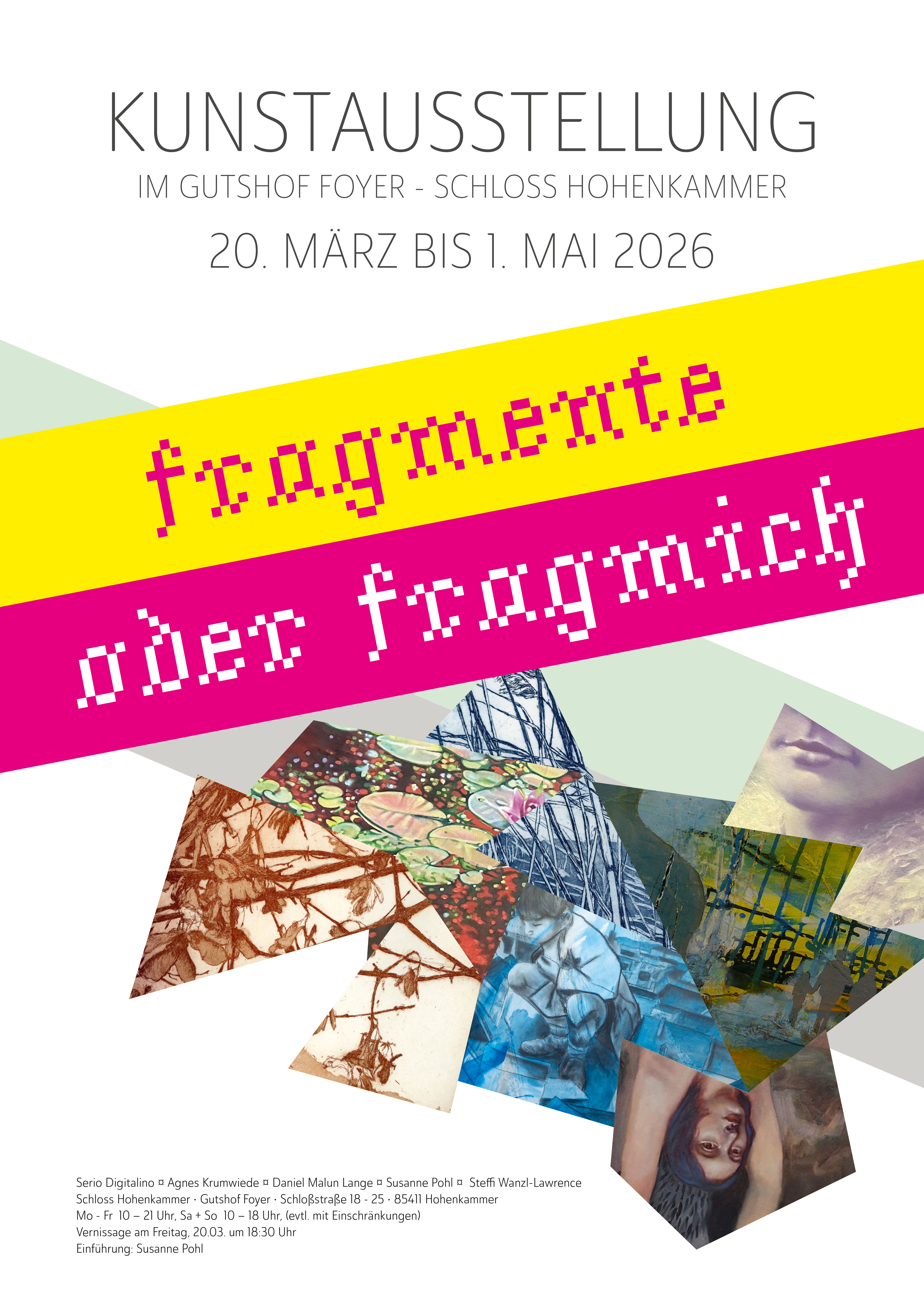 „Wenn es nur eine ein­zige Wahr­heit gäbe, könnte man nicht hun­dert Bil­der über das­selbe Thema malen“, so sprach kein gerin­ge­rer als Pablo Picasso. Fünf Künst­ler*in­nen stel­len aus, fünf Arten, die Wirk­lich­keit zu beg­rei­fen, Frag­men­te, die uns ein Stück Welt er­schlie­ßen kön­nen. Wir fra­gen Serio Digitalino, Agnes Krumwiede, Daniel Lange, Susanne Pohl und Steffi Wanzl-Lawrence nach ihrem Blick­win­kel, den sie in ihren Zeich­nun­gen, Gemäl­den und Gra­fi­ken im Schloss Hohen­kammer prä­sen­tie­ren werd­en.